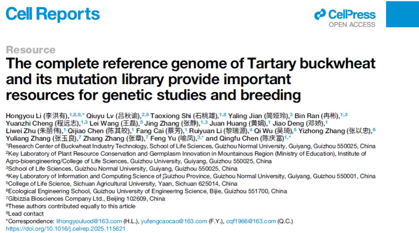近日,我校生命科学学院陈庆富/李洪有教授荞麦科研创新团队与喻凤副教授合作在Cell子刊《Cell Reports》(生物学一区Top)上发表了题为“The complete reference genome of Tartary buckwheat and its mutation library provide important resources for genetic studies and breeding”的研究论文。据悉,这是我校首次以第一完成单位和第一通讯单位在Cell子刊上发表论文,为促进我校生物学学科高质量发展做出了积极贡献。