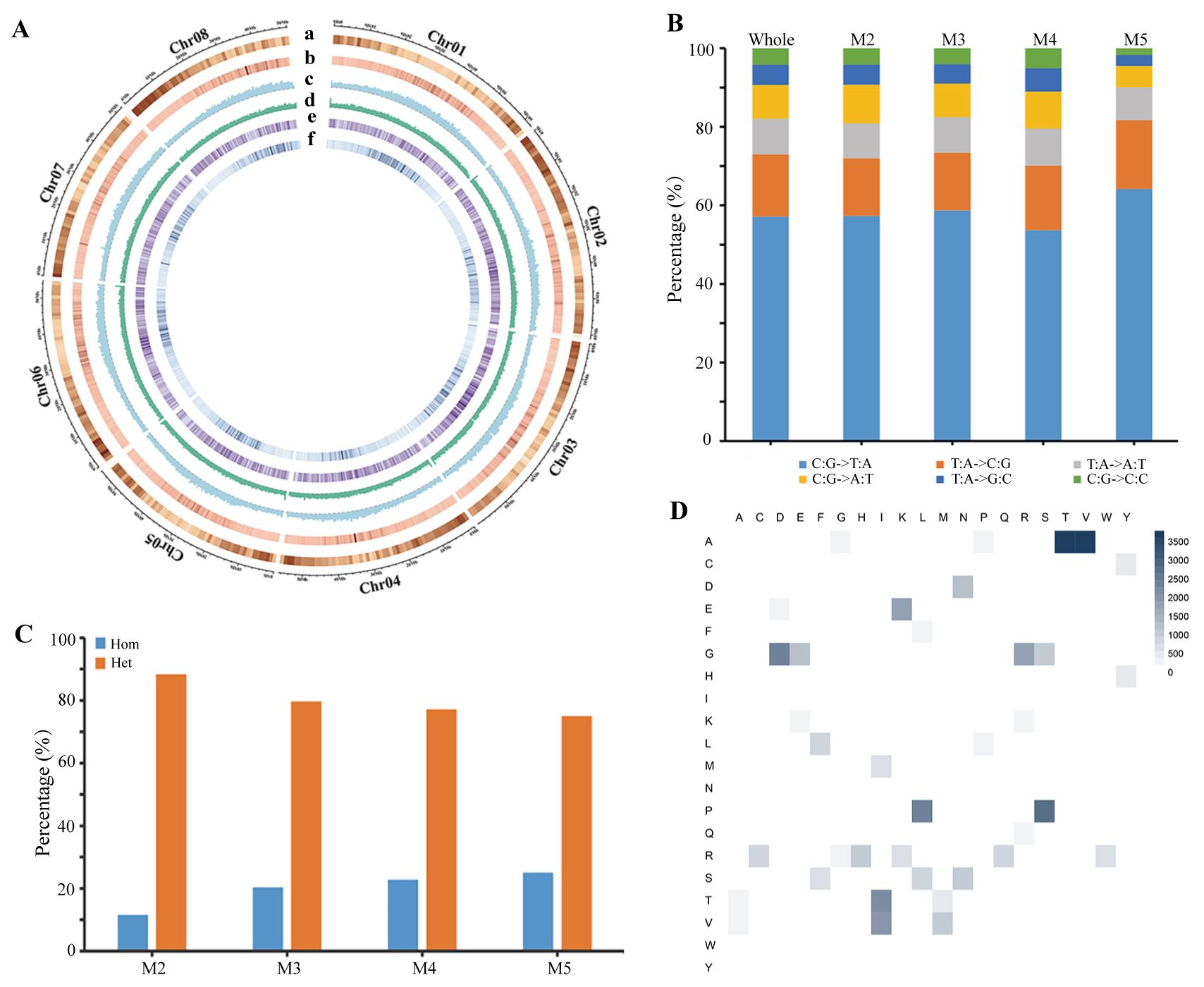 为解决突变体资源缺乏对苦荞功能基因组学和育种研究的限制,研究团队通过EMS对“贵苦1号”进行了大规模诱变,从8000个M2家系和1000个M3家系共70余万株分离单株中创制出1092份表型变异丰富的突变体(12个大类,62种表型变异)。通过突变体连续自交到M6代,研究团队进一步获得751份表型变异遗传稳定的突变体并从中筛选到二十余份具有重要育种价值的优异新种质(耐密植理想株型、高结实抗倒伏、超大粒、大粒薄壳、高黄酮、高蛋白、高抗性淀粉等)。在此基础上,研究团队对其中320份突变体进行了全基因组重测序,通过与“贵苦1号”参考基因组比对获得了这些突变体的全基因组突变信息,并鉴定到105,682个EMS诱导的SNPs和21,461个EMS诱导的InDels共造成了25,986基因的编码蛋白序列改变。PCR扩增测序证实EMS诱导的SNP阳性率为 95%(95/100),InDel阳性率为40%(4/10)。此外,研究团队还发现使用不同的参考基因组将极大的增加鉴定的EMS诱导的SNP(111.9倍)和InDel(18.6倍)的假阳性。