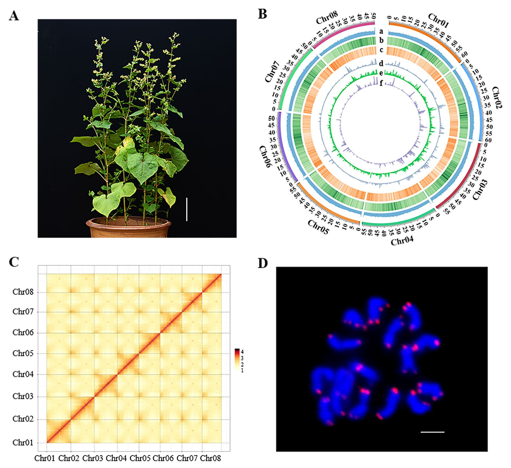 为解决苦荞参考基因组存在缺口和序列错误的问题,研究团队以自主培育的高产、广适苦荞新品种“贵苦1号”为材料,利用PacBio HiFi、HIC和ONT数据组装了首个苦荞端粒到端粒(T2T)无缺口高质量参考基因组。该基因组大小为453.83 Mb,零缺口,共注释到43,441个蛋白编码基因,并完整解析了全部端粒和着丝粒序列信息。利用荧光原位杂交(FISH)技术证实了苦荞的端粒重复序列为全新的六碱基重复序列“GAAACC”,而不是大多数植物端粒中保守的7碱基重复序列“CCCTAAA”。通过与已发布的苦荞“Pinku1”和“Qianku3”基因组比较,研究团队鉴定到大量SNP、InDel和染色体结构变异(SV),并通过PCR扩增测序证实了这些鉴定的变异具有较高的可靠性。